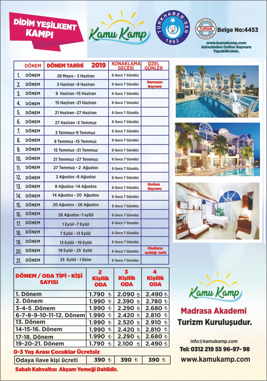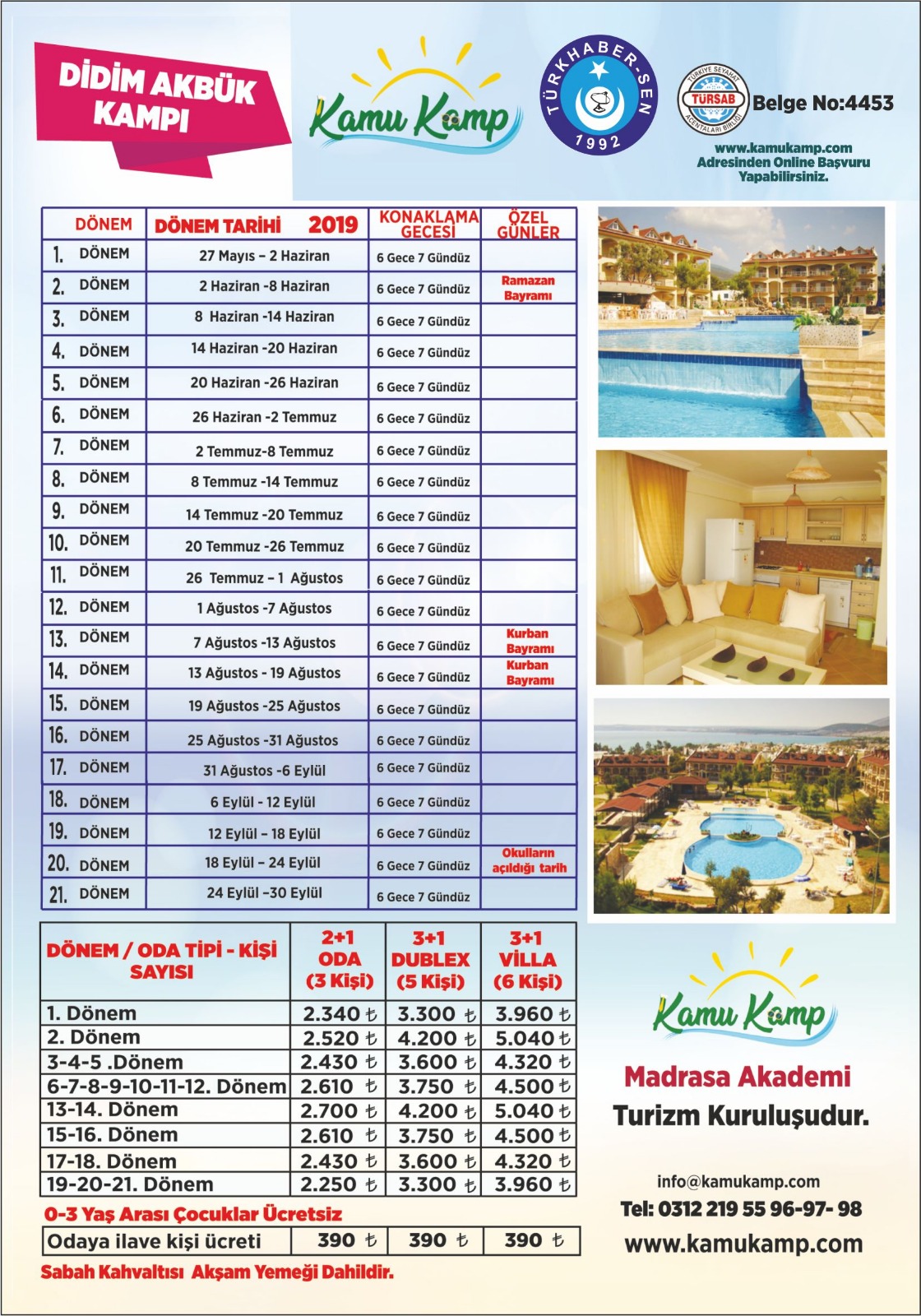 Bu çerçevede Didim Yeşilkent ve Didim Akbük kampları 21 döneme ayrılan çok cazip yaz sezon fiyatları üyelerimizin dikkatine sunulmuştur. İlgilenen üyelerimizin 0312 219 5596-98 nolu çağrı merkeziyle iletişime geçmeleri gerekmektedir.
